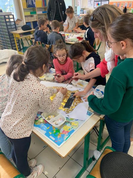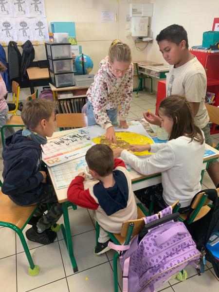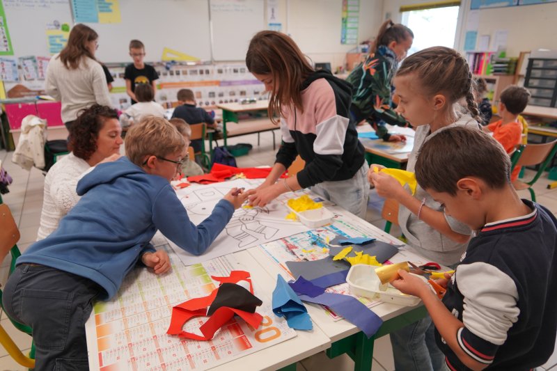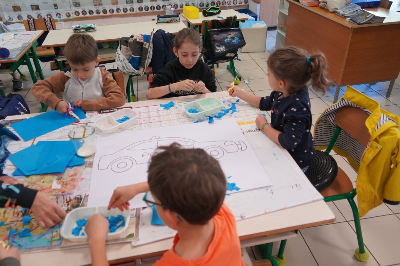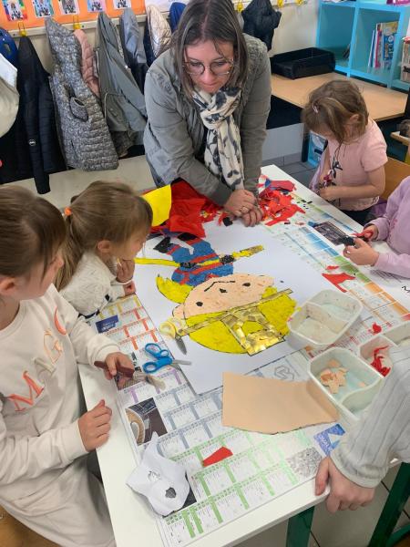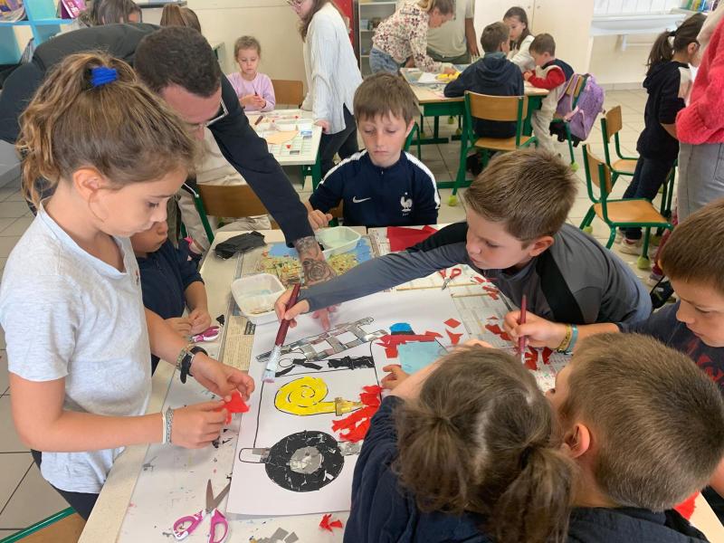 En lien avec le thème d’année sur les métiers, les quatre classes, mélangées en petits groupes multi-âges, ont participé à quatre ateliers autour des métiers de la santé et de la sécurité. Tour à tour, chaque groupe a appris un chant dansé sur les métiers, réalisé des créations visuelles en papiers découpés et déchirés (camion de pompier, voiture de police, camion de gendarme), appris à porter secours et alerter, et surtout rencontré un invité spécial : Yohann Charrier, à la fois pompier volontaire à Mouilleron-Saint-Germain et pompier professionnel à la caserne de Chantonnay.
